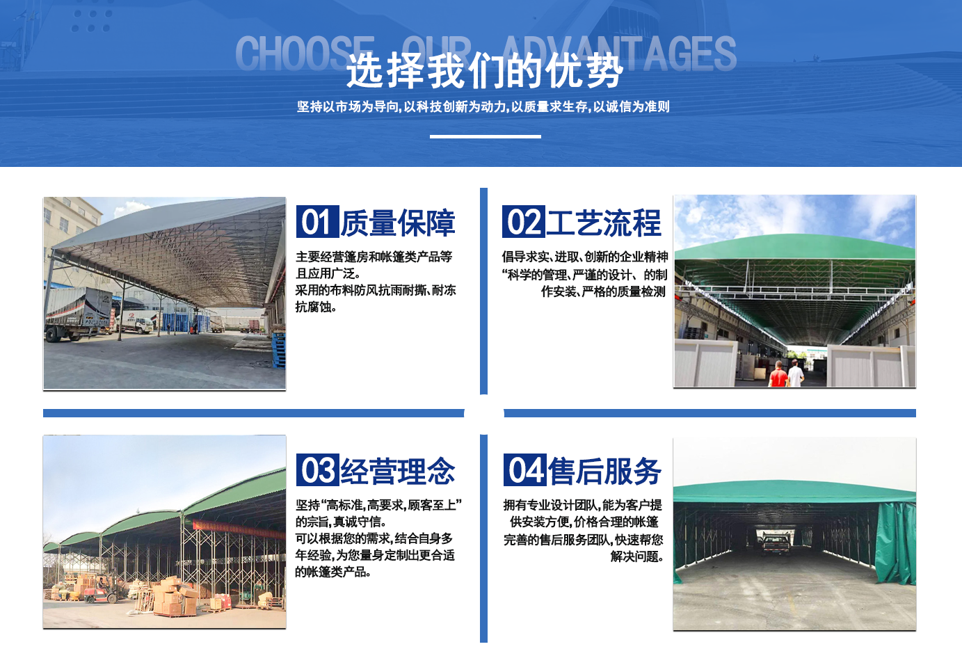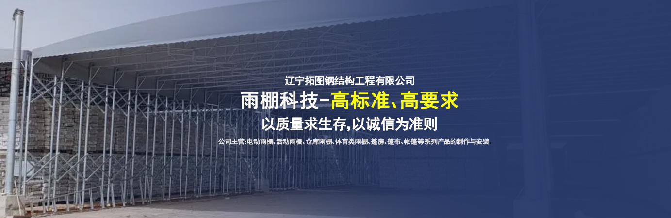 遼寧拓圖鋼結構工程有限公司是一家專業從事推拉篷設計、制作、安裝、使用、維修的綜合性公司。公司主營:電動雨棚、活動雨棚、倉庫雨棚、體育類雨棚、篷房、篷布、帳篷等系列產品的制作與安裝?! ?nbsp; 遼寧拓圖鋼結構工程有限公司堅持以市場為導向,以科技創新為動力,以質量求生存,以誠信為準則,倡導求實、進取、創新的企業精神?!翱茖W的管理、嚴謹的設計、 的制作安裝、嚴格的質量檢測、良好的后期服務成就企業的信譽,為您提供優質服務?! ?nbsp; 遼寧拓圖鋼結構工程有限公司傾力于開發應用三維空間結構與新材料的結合,將廣告藝術視覺表現形式與張力膜材科學的結合,推出多彩推拉蓬,依靠先進的科學技術,將推拉蓬建筑表現形式無限延伸,立志走在建筑科學的前沿,引導建筑時尚潮流,我們的目標是使推拉蓬建筑在中國發展壯大?! ?nbsp; 遼寧拓圖鋼結構工程有限公司憑著極強的事業熱情和豐富的專業經驗以“勤勉進取、銳意創新、至誠至信”的精神使公司得到迅速健康發展,業務范圍遍及全國??茖W的管理、嚴謹的設計、高標準的制作安裝流程,嚴格把控產品質量,熱誠的售后服務是企業競爭力的源泉?! ?nbsp; 遼寧拓圖鋼結構工程有限公司人愿以最誠摯的態度,歡迎廣大客戶的蒞臨與溝通!愿為市場提供優...